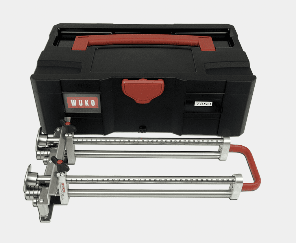 The Wuko Uber Bender Duo 7300 features two bending angled wheels, which allows for bends over 90° up to 100°. It also allows for the bender to be over previous bends, such as bending along longitudinal beadings, or panel profile bends. Unlike the 6350, this bender features two sets of rollers and a handle, making it ideal for longer straight lines.